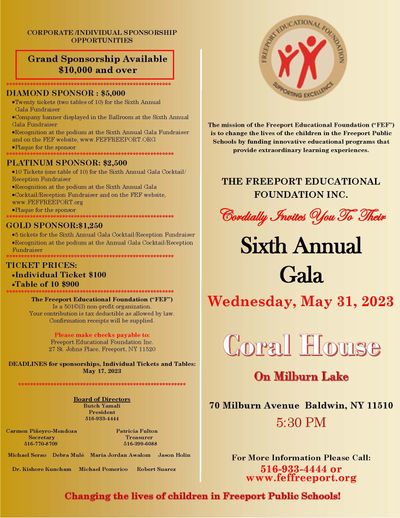 The Freeport Educational Foundation is always looking for volunteers. If you wish to join us and play an active role in our fundraising efforts, you can reach out to our president, Butch Yamali, at (516) 933-4444 (ext. 202).
